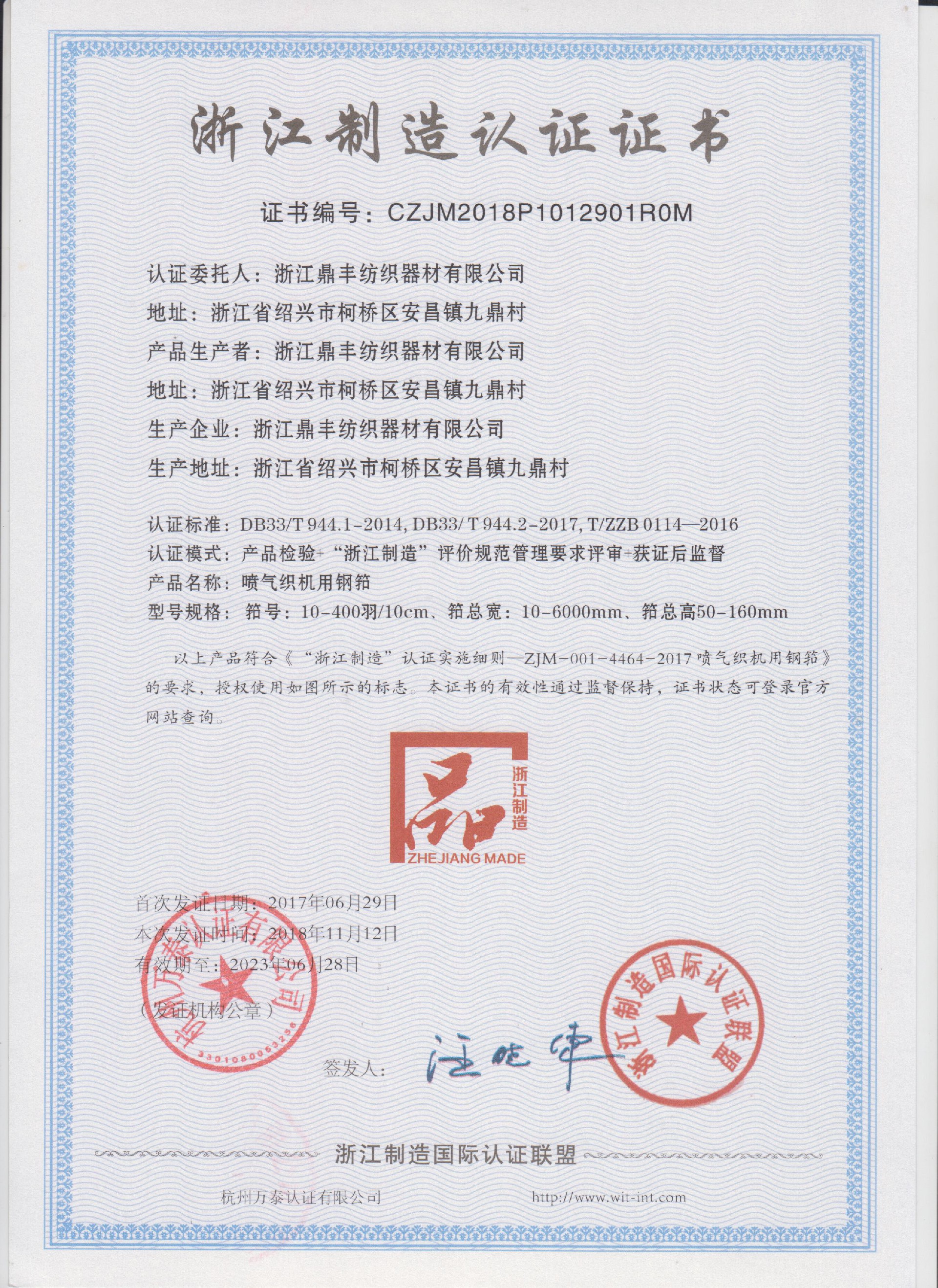 浙江鼎豐紡織器材有限公司始建于1986年,是一家專業(yè)生產(chǎn)各類無(wú)梭織機(jī)用鋼筘:噴氣筘、噴水筘、劍桿筘、其他類型鋼筘;鋁合金綜框、鋼片綜、停經(jīng)片、經(jīng)軸、織軸、卷布輥等產(chǎn)品及配件的民營(yíng)企業(yè)。
